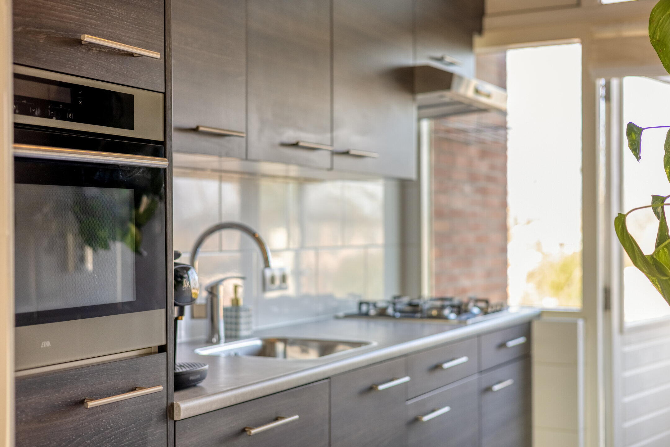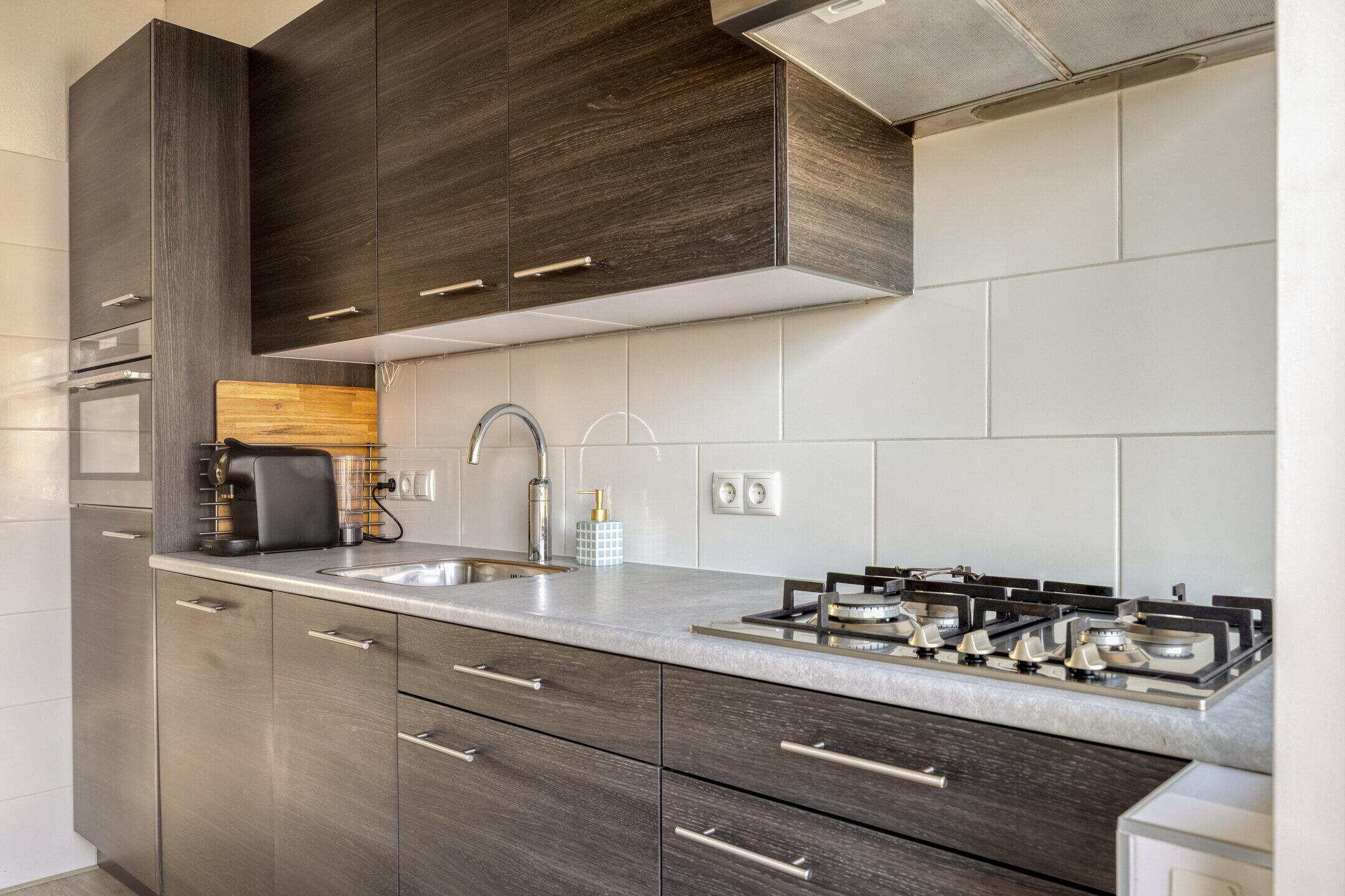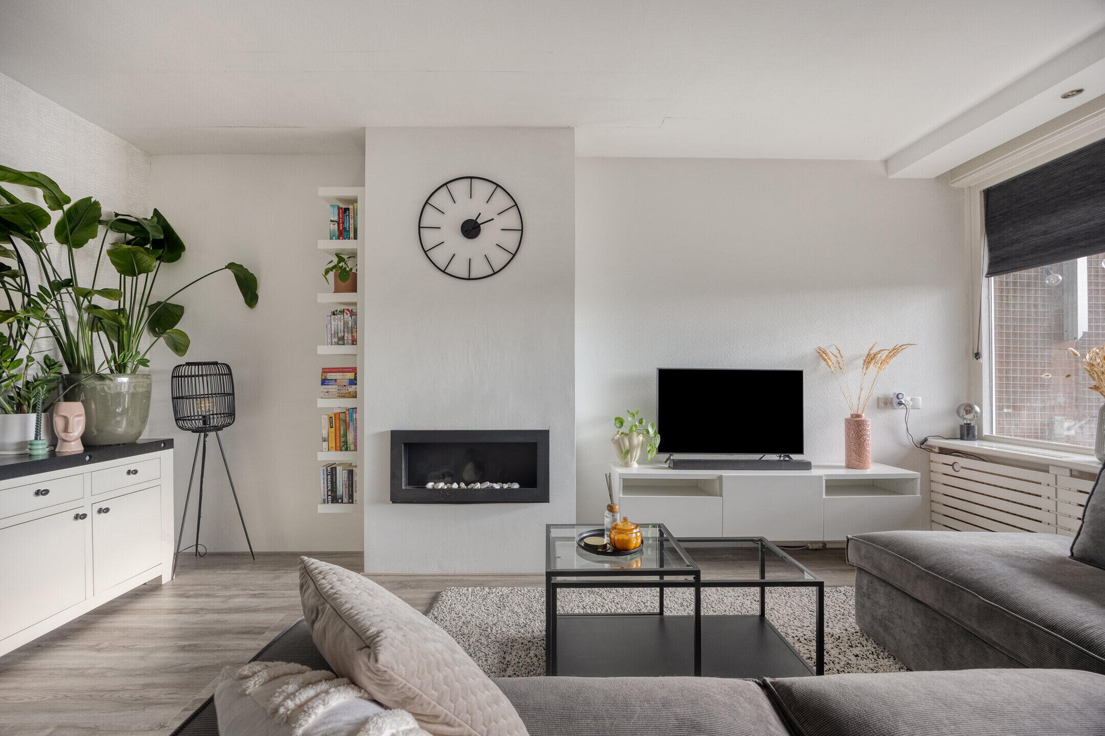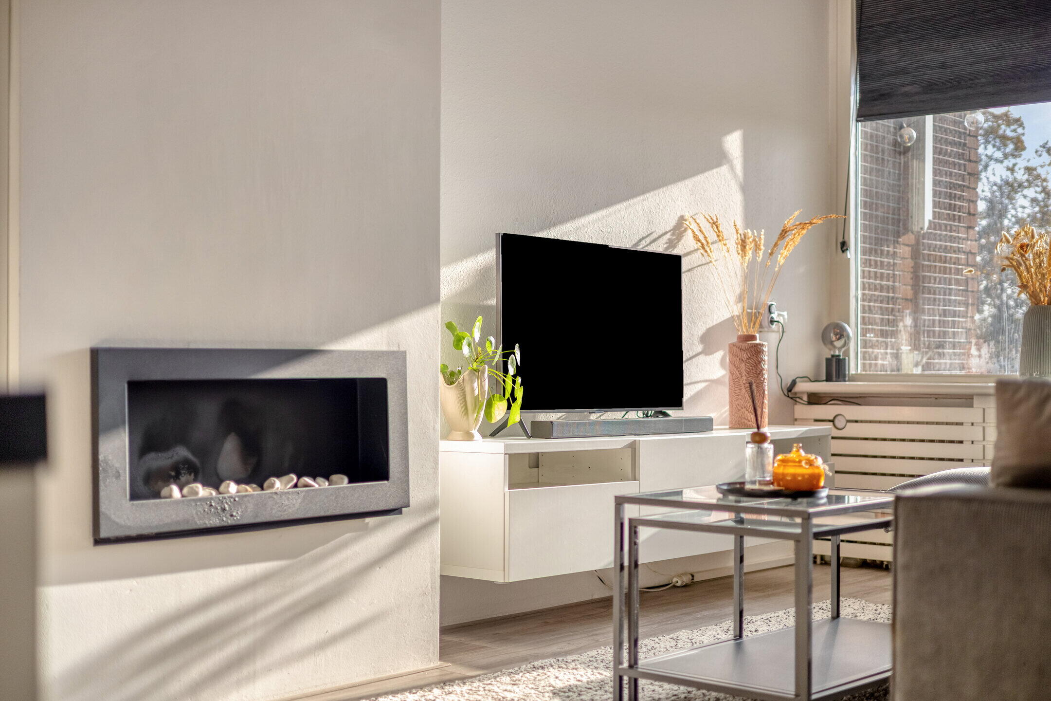 De woonkamer is een plaatje! Sfeervol, ruim en heerlijk licht dankzij de grote raampartijen. De haard op bio ethanol zorgt voor extra gezelligheid en er is meer dan genoeg ruimte voor een grote loungebank én een royale eettafel. Vanuit de woonkamer loop je zo het eerste balkon op, compleet met zonnescherm — perfect voor lange zomeravonden. De moderne keuken is bereikbaar via de hal en voorzien van diverse inbouwapparatuur. Hier vind je alles wat je nodig hebt om met plezier te koken. Ook heb je toegang tot het tweede balkon: ideaal voor een kop koffie in de ochtendzon.