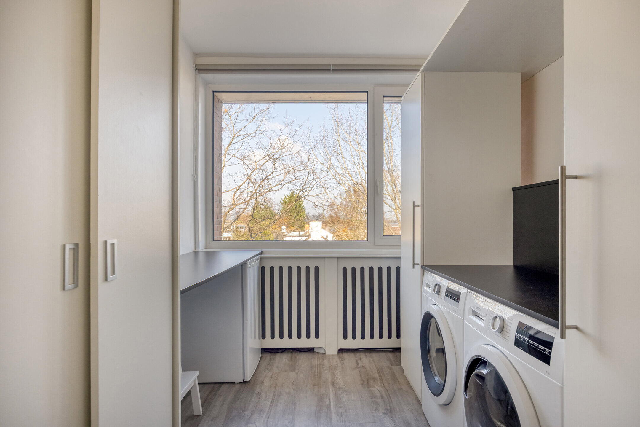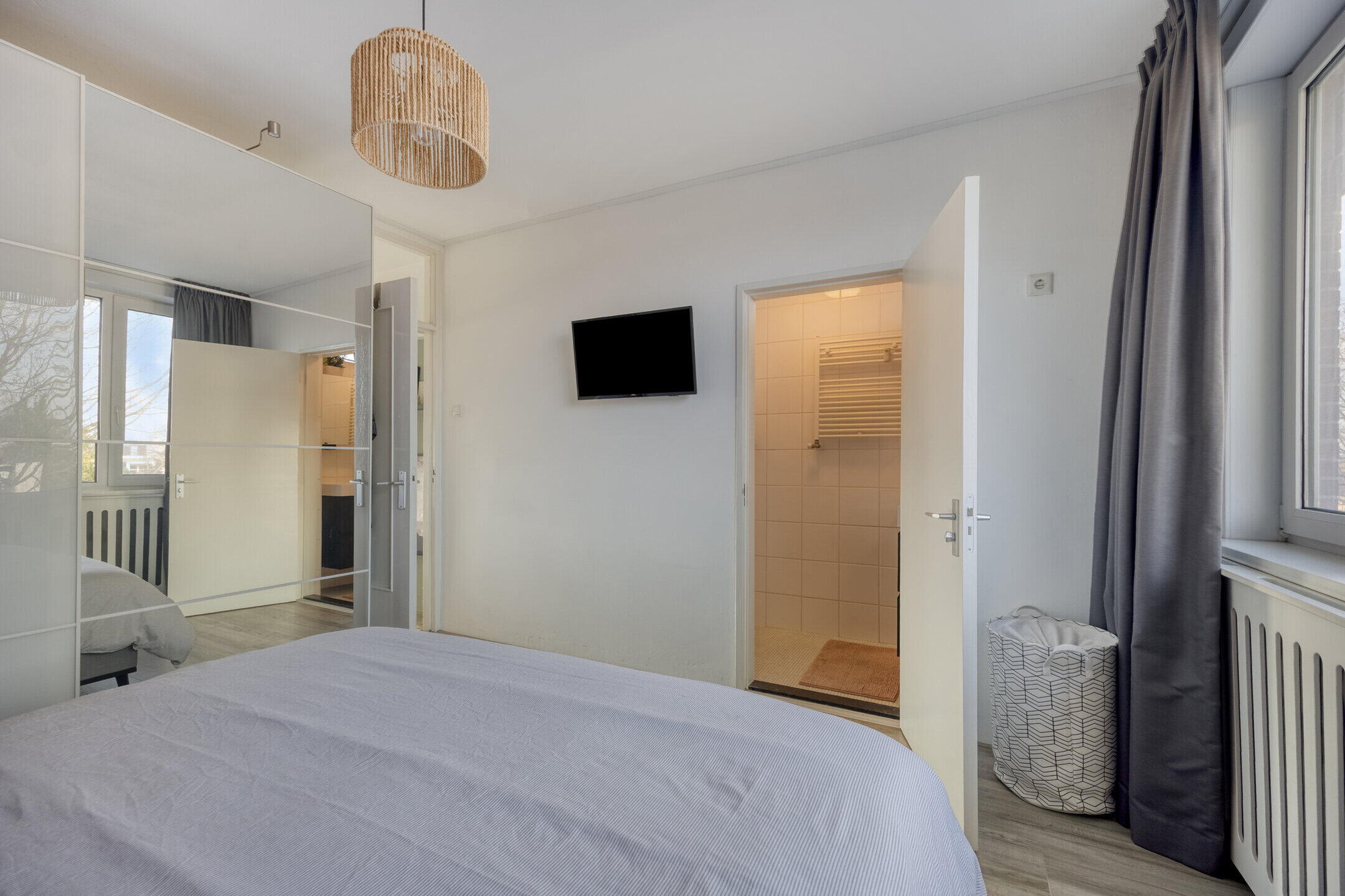 Het appartement telt twee slaapkamers. De kleinere kamer ligt aan de hal en is ideaal als kantoorruimte of als inloopkast en beschikt over een wasmachine en droger aansluiting. De grote slaapkamer biedt volop ruimte voor een tweepersoonsbed en garderobekasten en geeft direct toegang tot de badkamer. De moderne badkamer is keurig afgewerkt met lichte tegels, een stijlvol wastafelmeubel en een fijne douche.