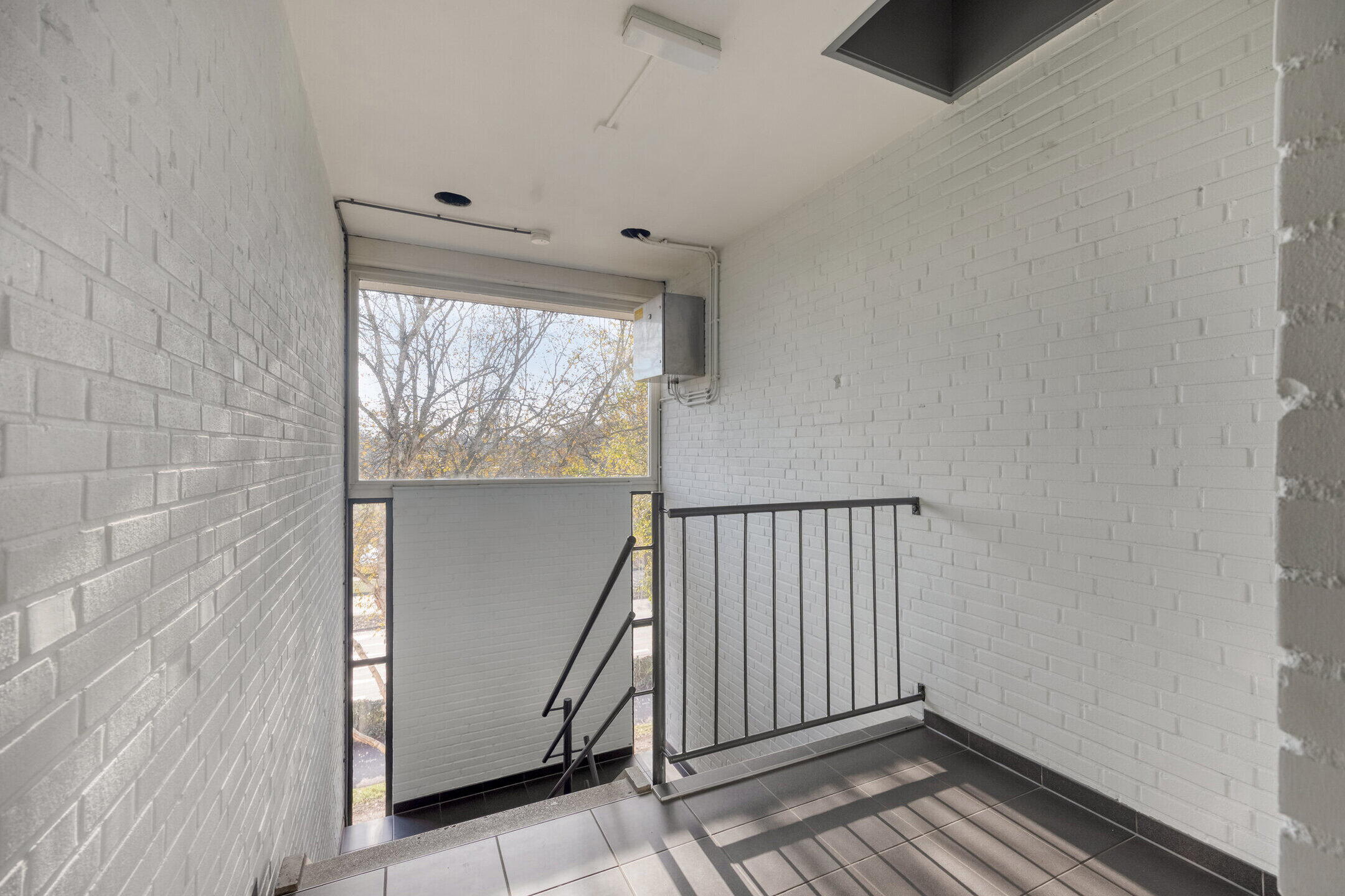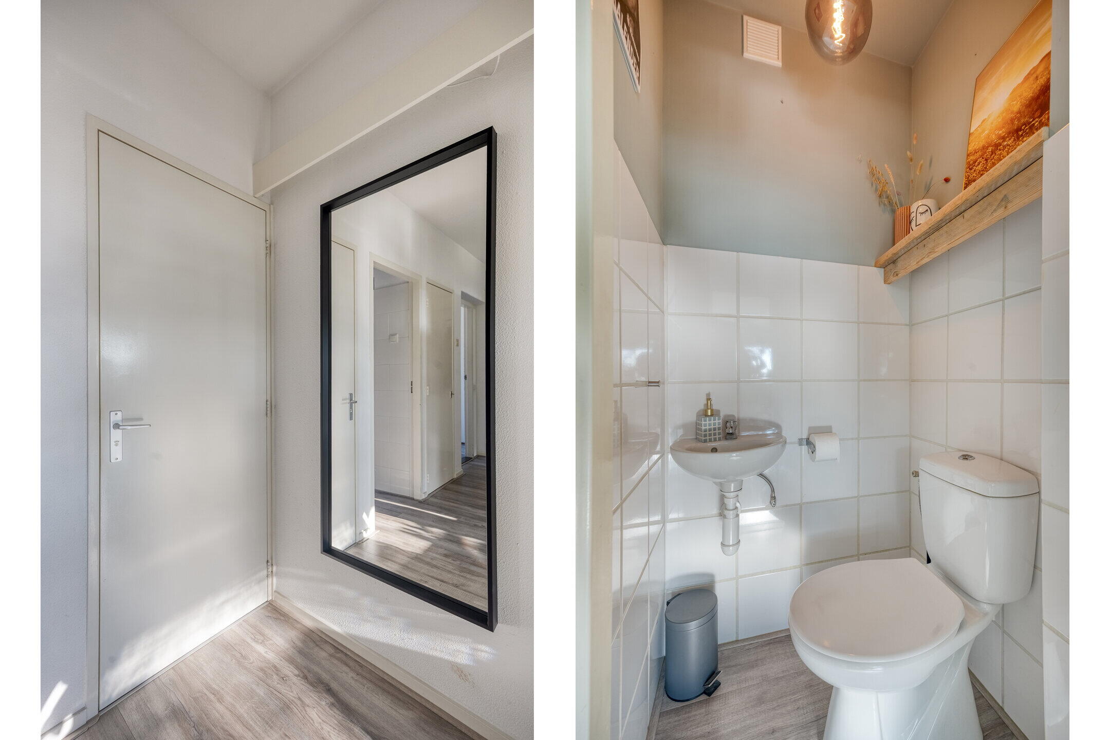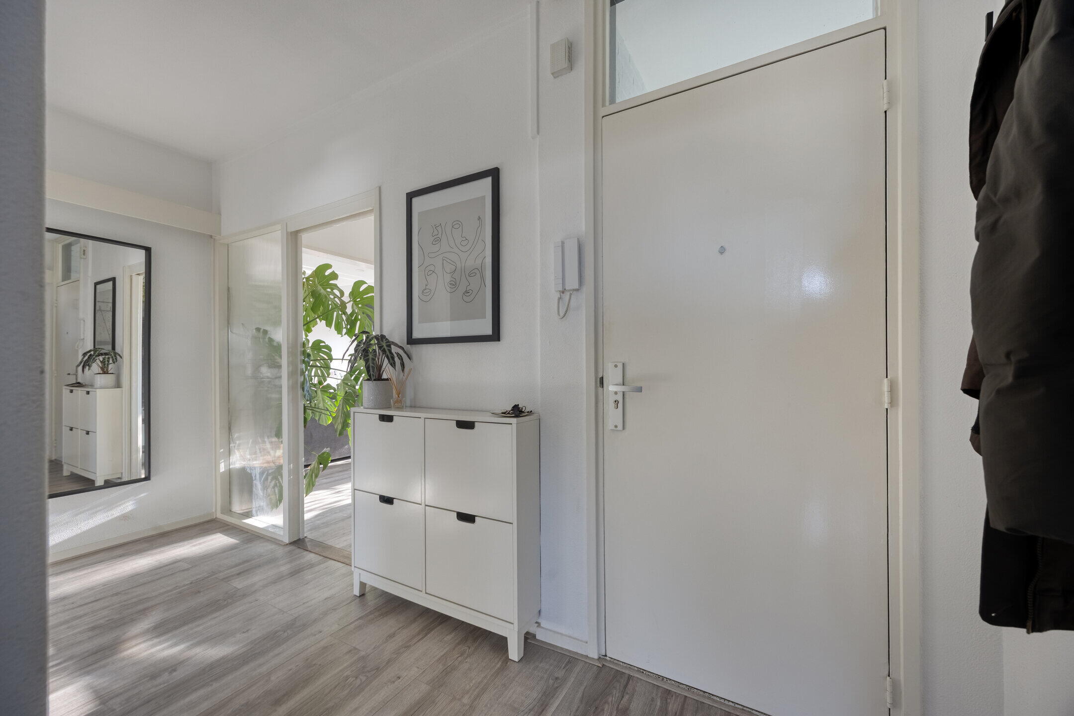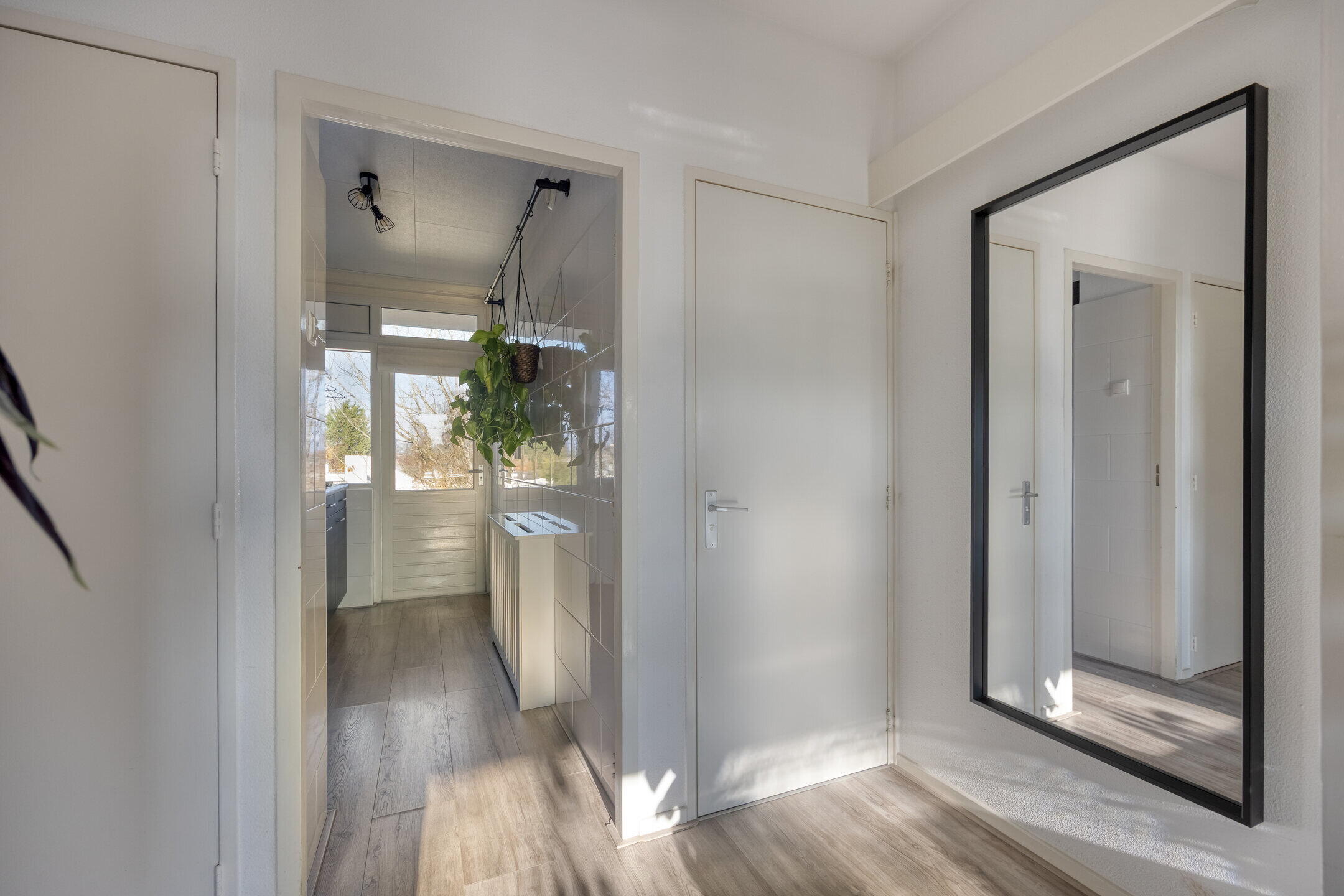 Via de ruime, lichte hal met strakke wanden en een mooie vloer kom je binnen. Vanuit hier heb je toegang tot één van de slaapkamers, perfect als thuiskantoor of praktische kastenkamer. Ook de keuken en het toilet zijn vanuit de hal bereikbaar. De hal zet direct de toon: modern, fris en uitnodigend.